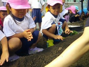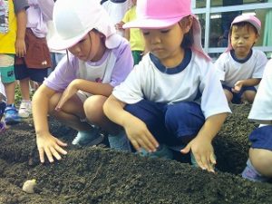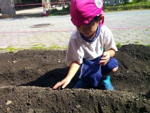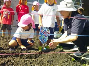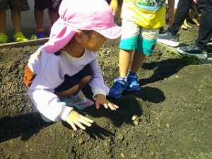 和太鼓の後には、5歳児のお兄ちゃん・お姉ちゃんと一緒にジャガイモを植えました!
