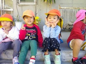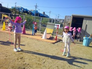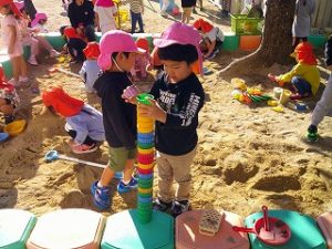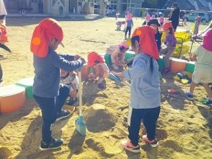 園庭では、砂遊びや雲梯棒、縄跳びなどで遊んでいましたよ!