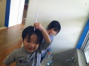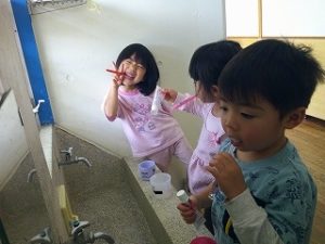 ご飯の後は歯磨きタイムです。鏡を見ながら綺麗に磨いています✨