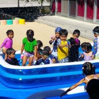 5歳児の水遊びの様子です🌞 水遊びでの約束(友達の顔に水をかけない、水に顔をつけない、走らない等)を確認し、準備運動をして活動に入りました! 「今日水遊びだー✨」と朝から楽しみにしていた子ども達! 水鉄砲で戦いごっこをし …